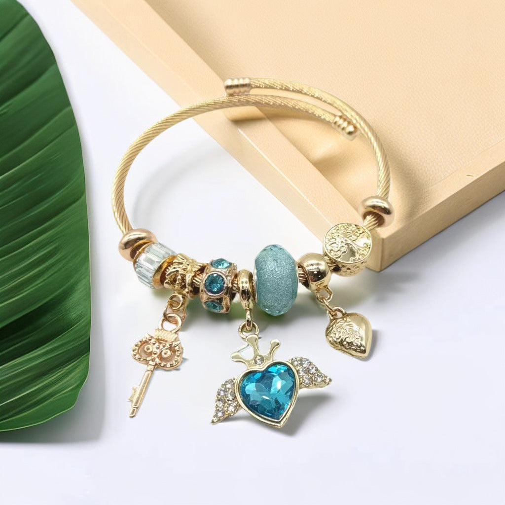 Discover this vibrant set of heart - and - wing themed charm bracelets. Each golden wire bangle is adorned with colorful beads, sparkling crystals, and adorable charms like hearts, wings, and tiny pendants. Available in red, pink, and green color schemes, they blend playful designs with a touch of glamour. Perfect for adding a pop of color to your daily style or gifting to someone special. Let these bracelets be a sweet, stylish reminder of love and freedom, one charm at a time.