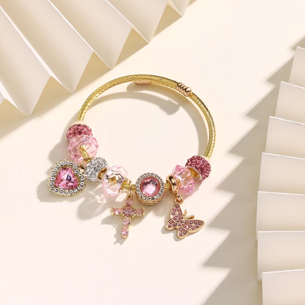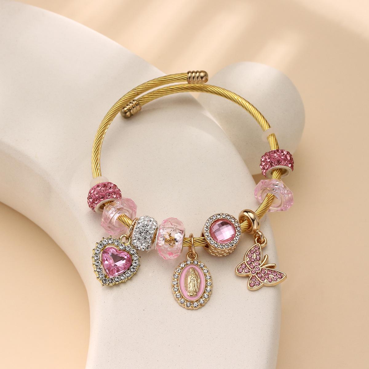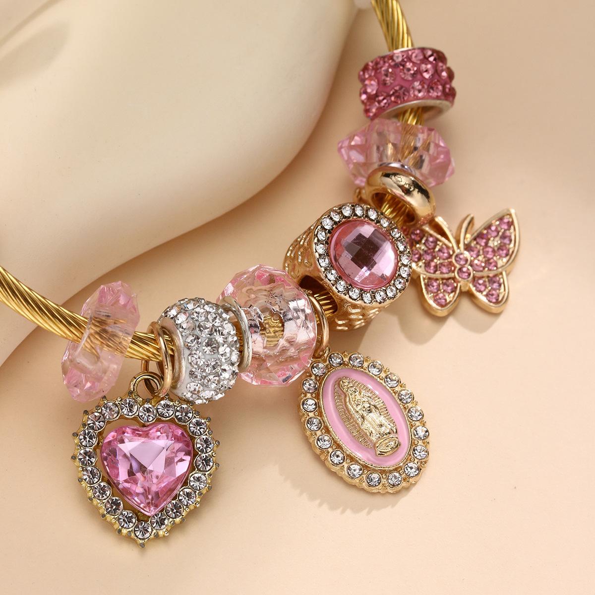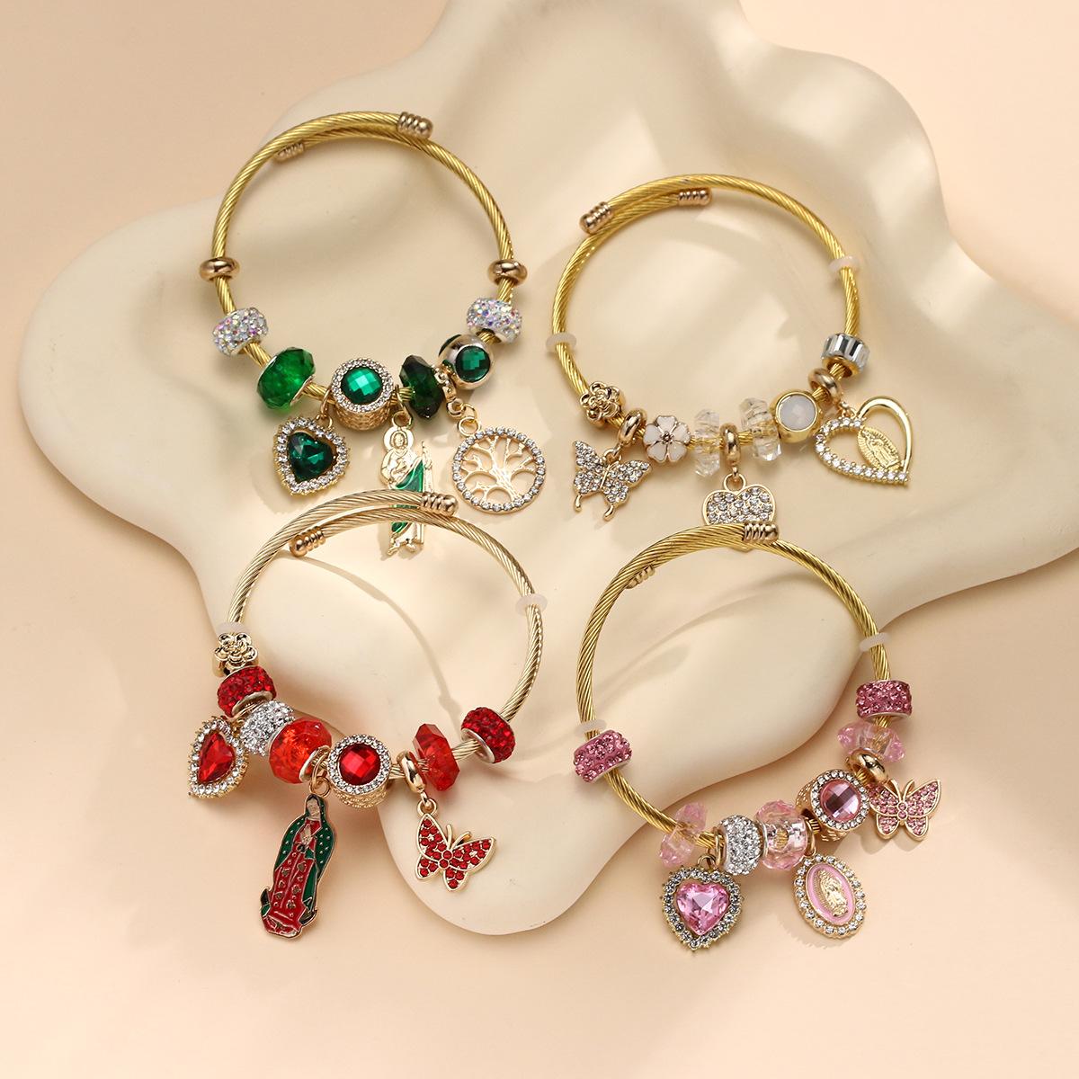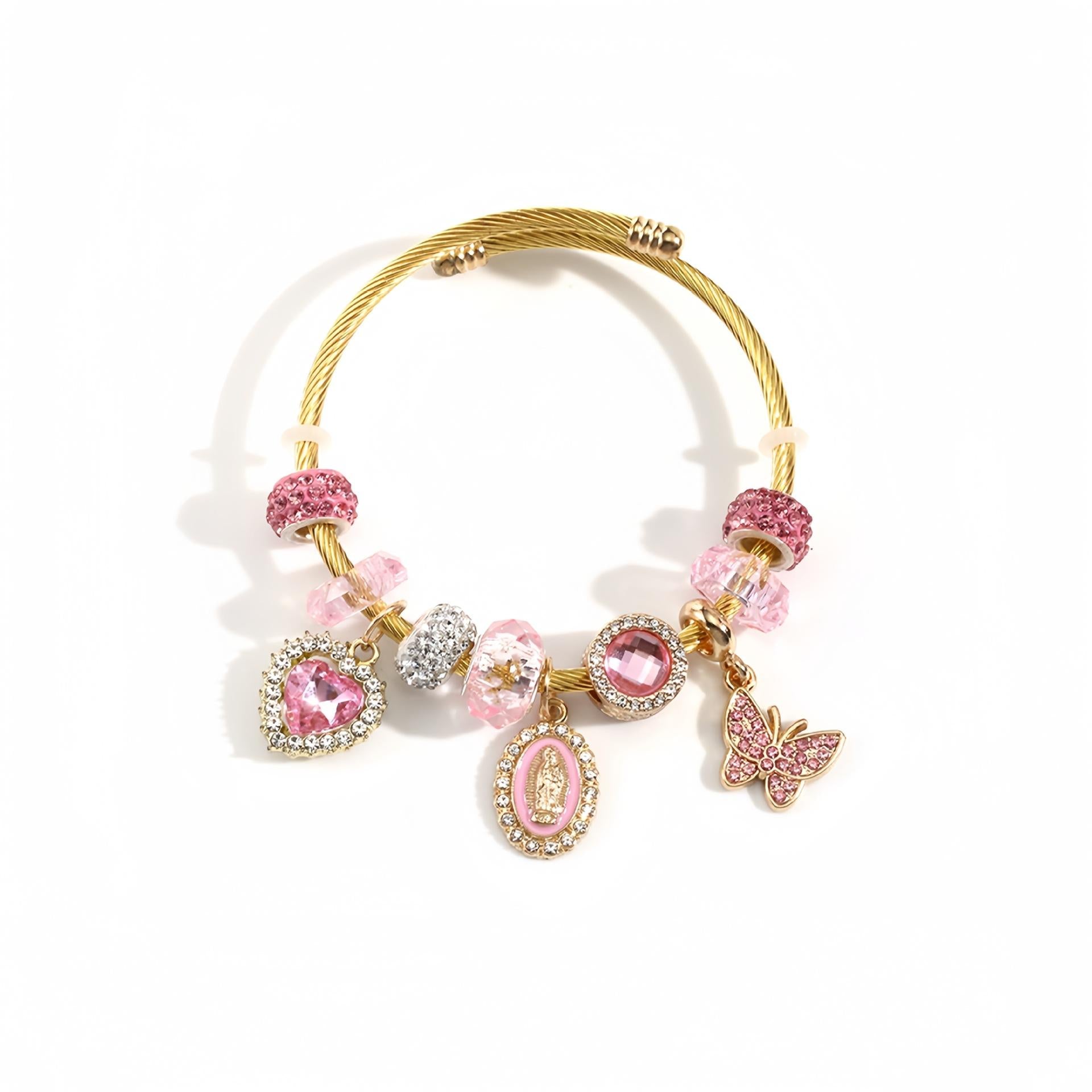 This religious - themed charm bracelet is a stunning accessory that beautifully combines faith and fashion. Crafted on a golden - toned wire bangle, it is adorned with an array of eye - catching charms and beads. Sparkling crystal - encrusted beads add a touch of glamour, while a prominent charm featuring a religious figure serves as a powerful symbol of devotion. Additionally, there are other intricate charms, like the heart - shaped one embellished with diamonds, adding layers of meaning and style.